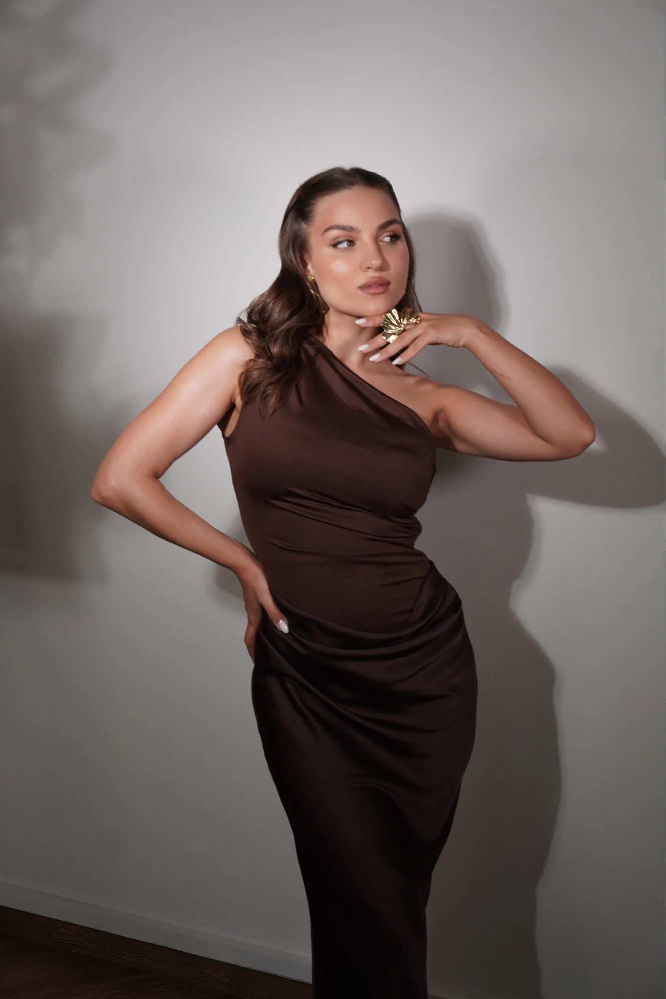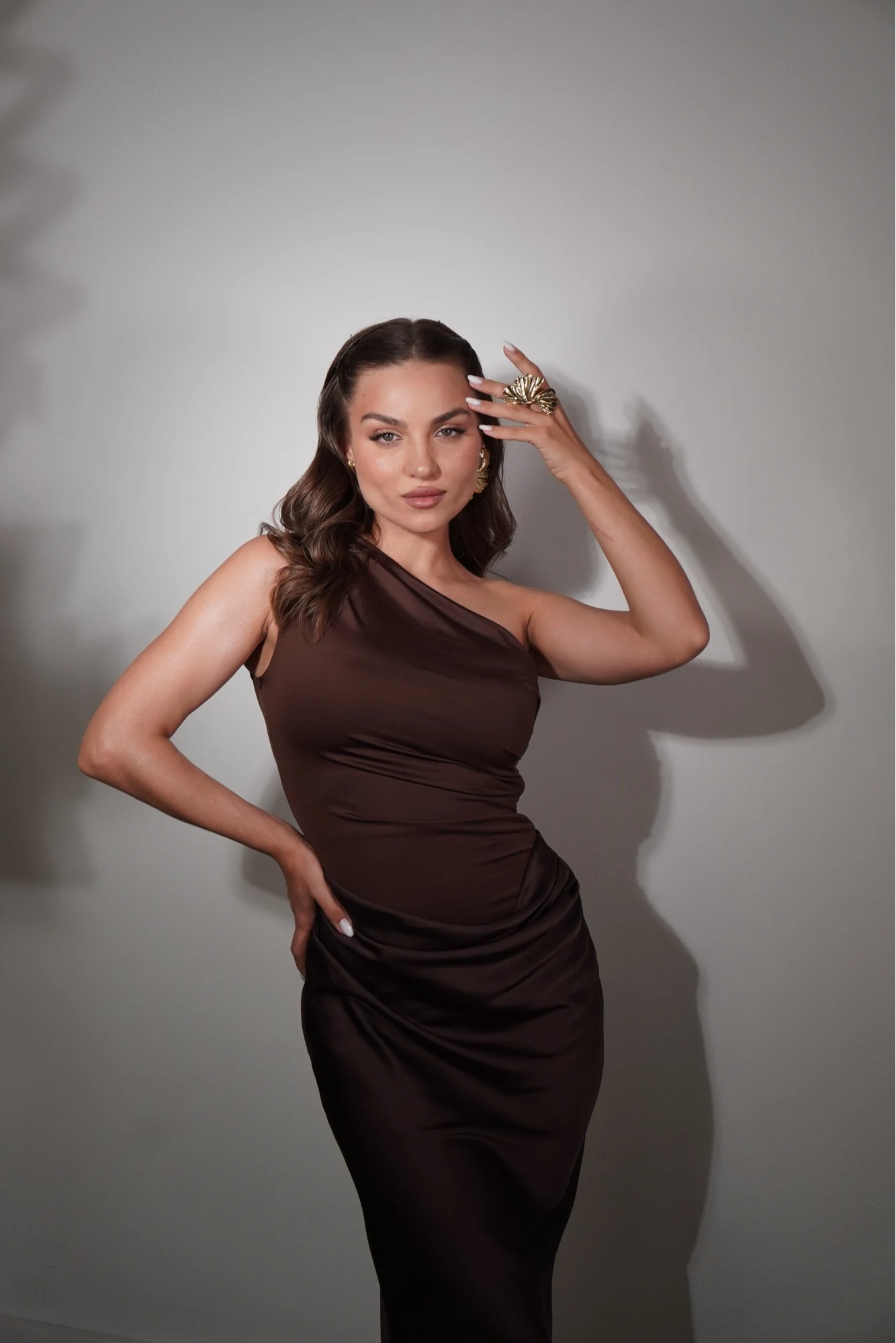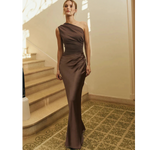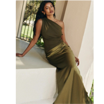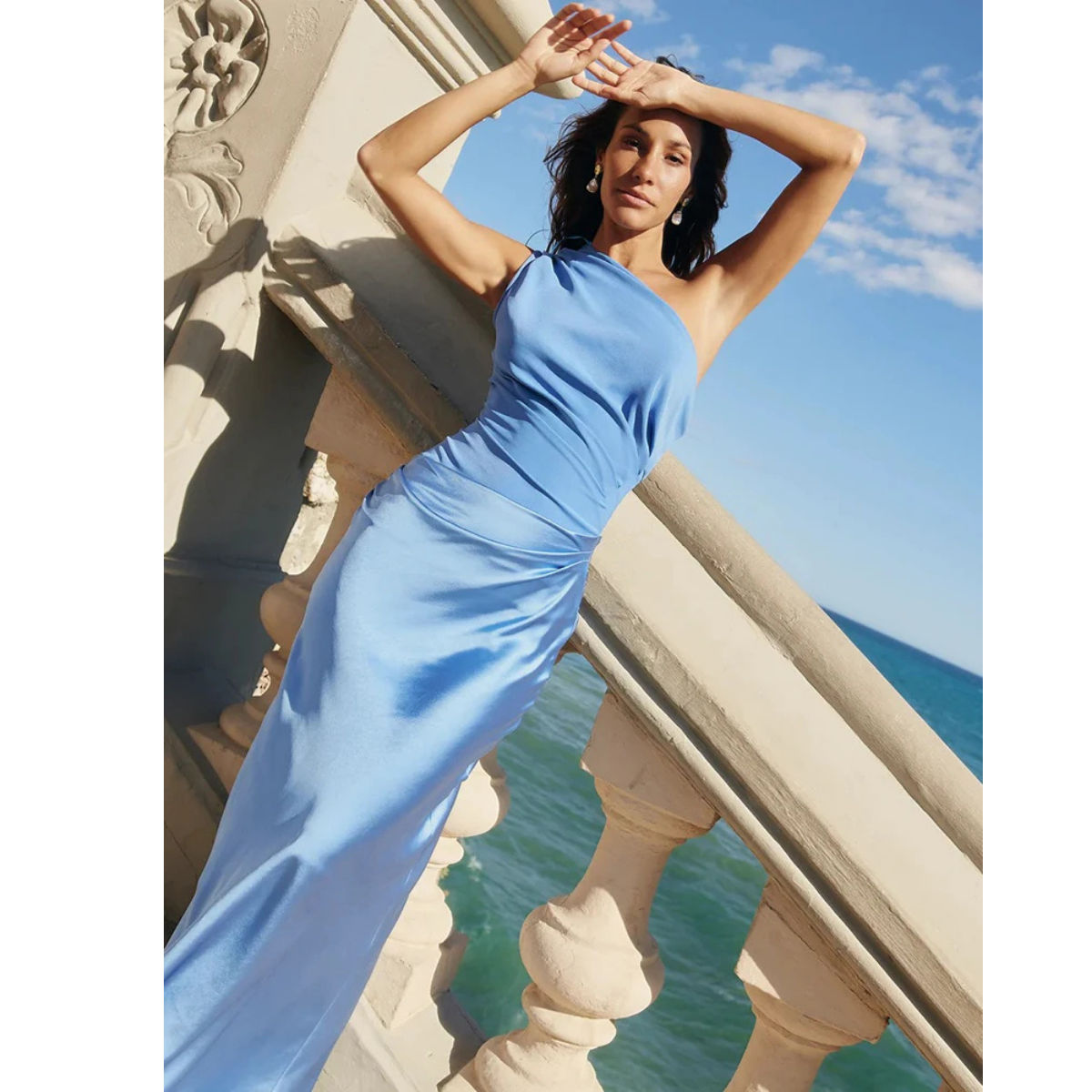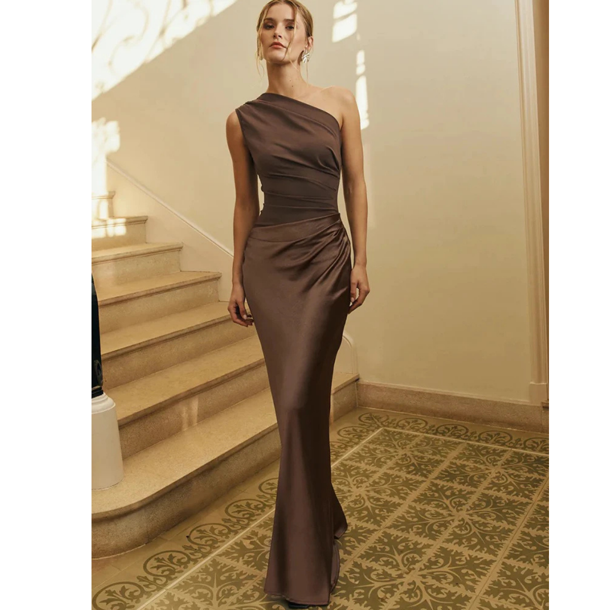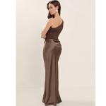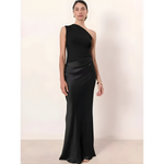 Elevate any special occasion with our Aria Satin Evening Dress. Designed with a sleek, asymmetrical neckline, this dress drapes beautifully over the body, offering a smooth, glossy finish that catches the light with every step.