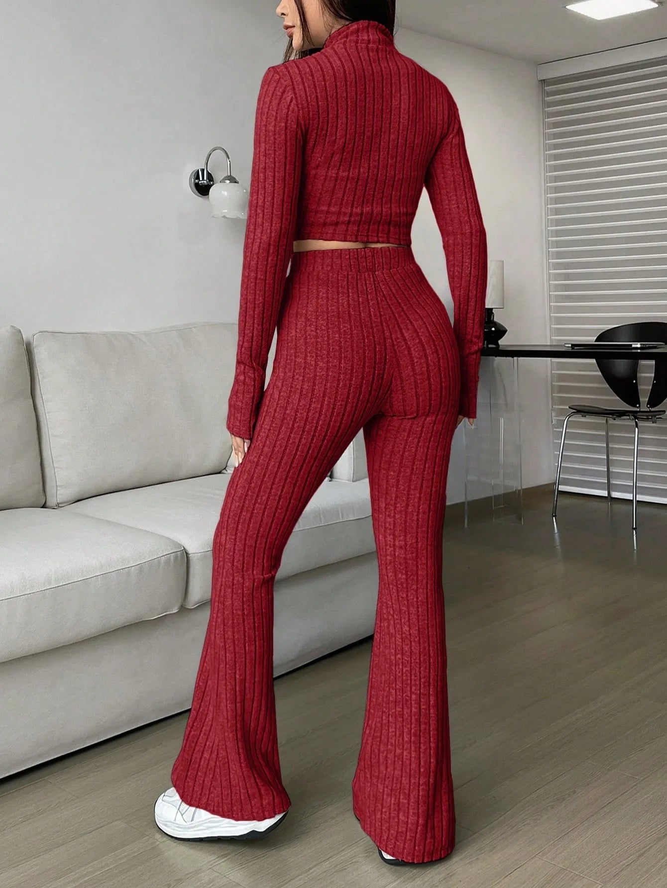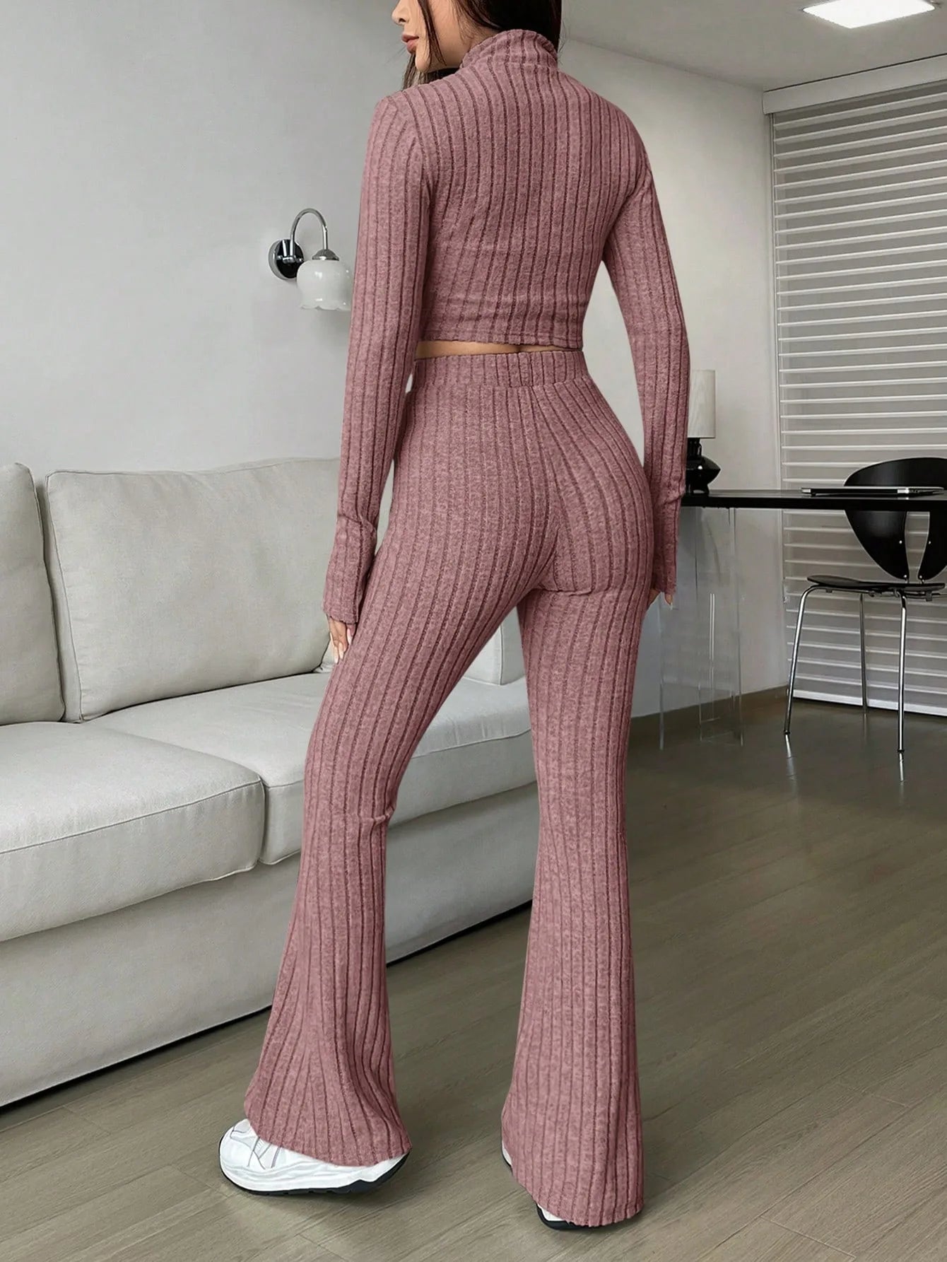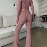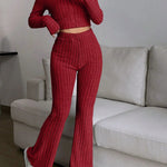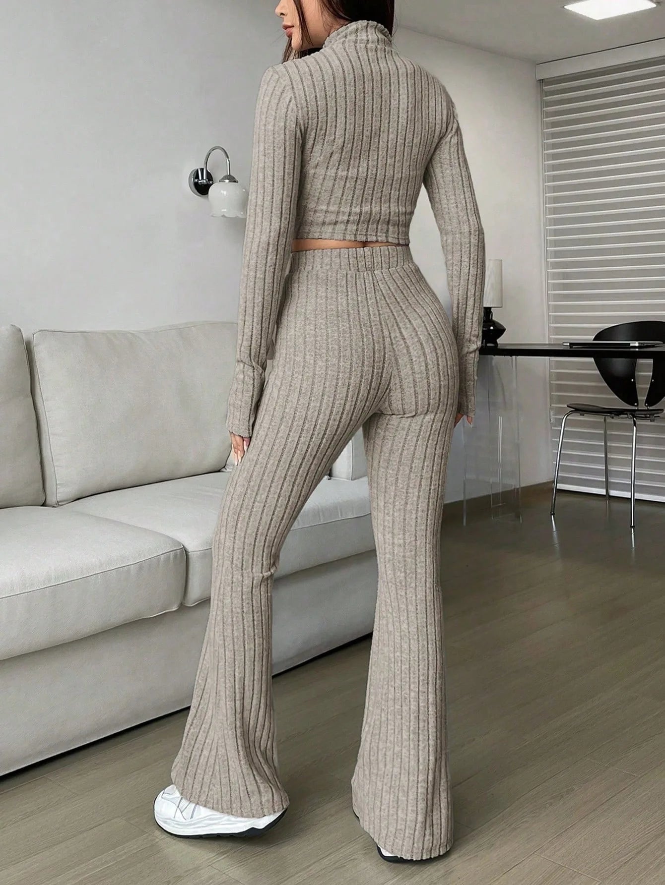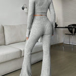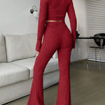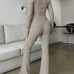 Step into laid-back style with our Cropped Knit Zip-Up Set with Flare Pants. This cozy two-piece features a soft, ribbed knit zip-up top with a chic collar and matching flare pants, combining comfort and elevated style in one coordinated set.